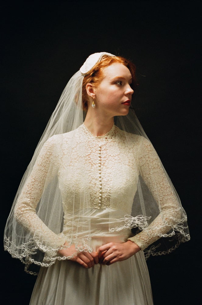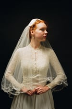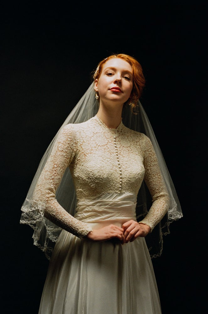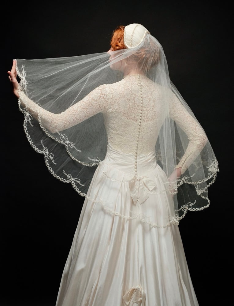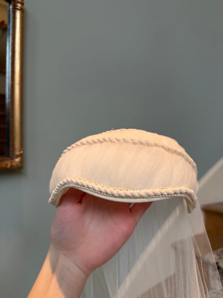Original 1950s veil by Vogue Bridals, featuring a head piece adorned with pearls and a comb to secure to the hair. There are two layers trimmed with lovely bow lace, and the shorter layer can be worn as a blusher.