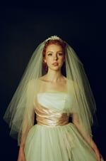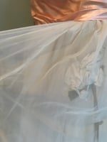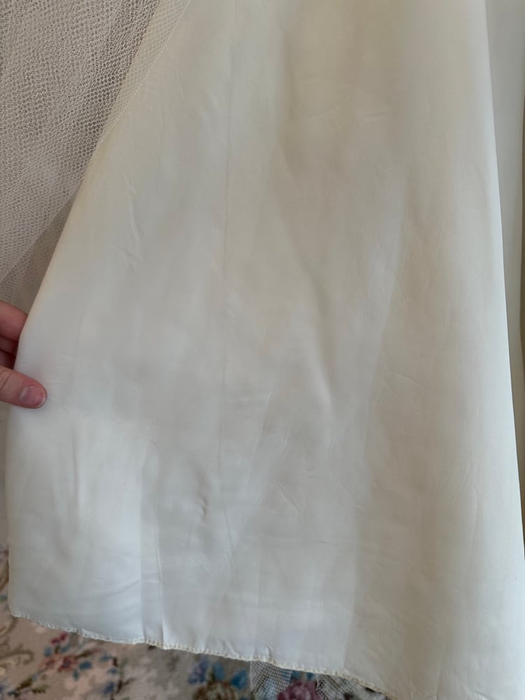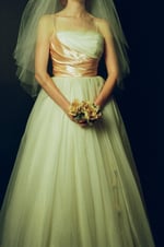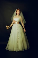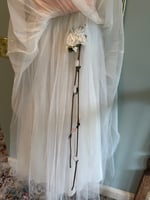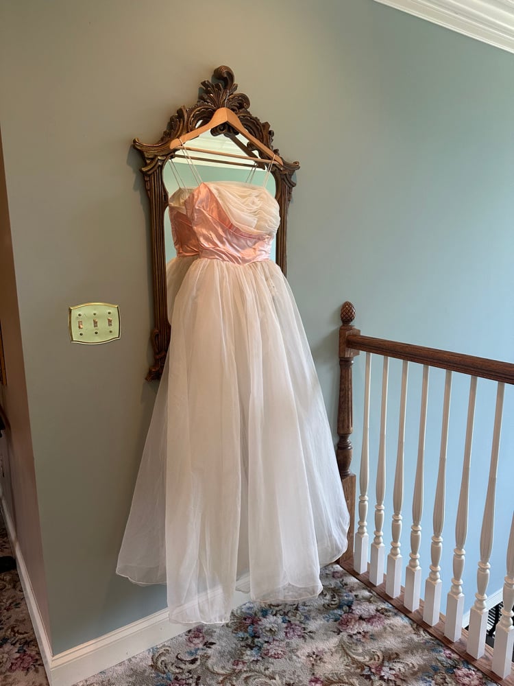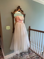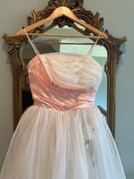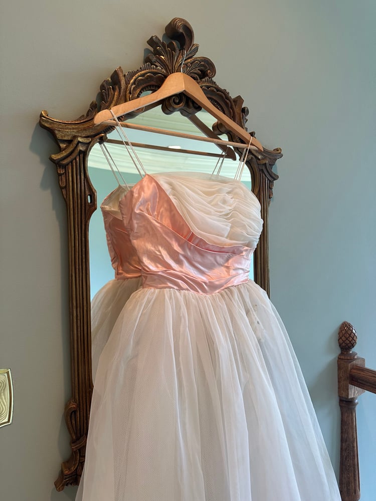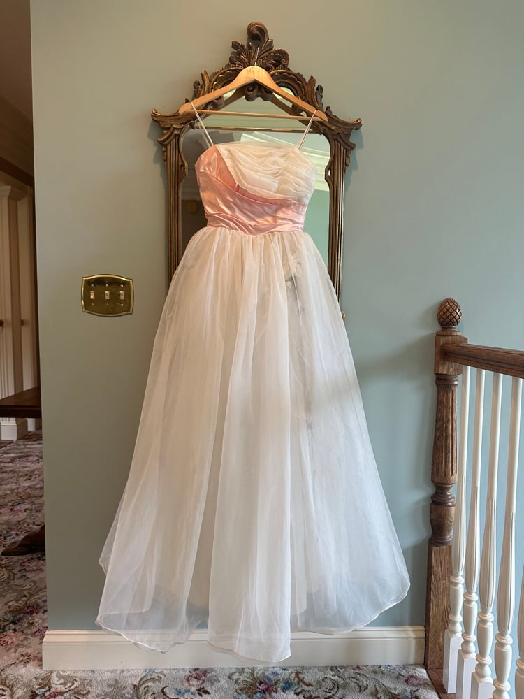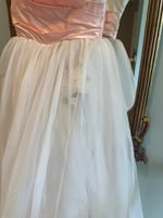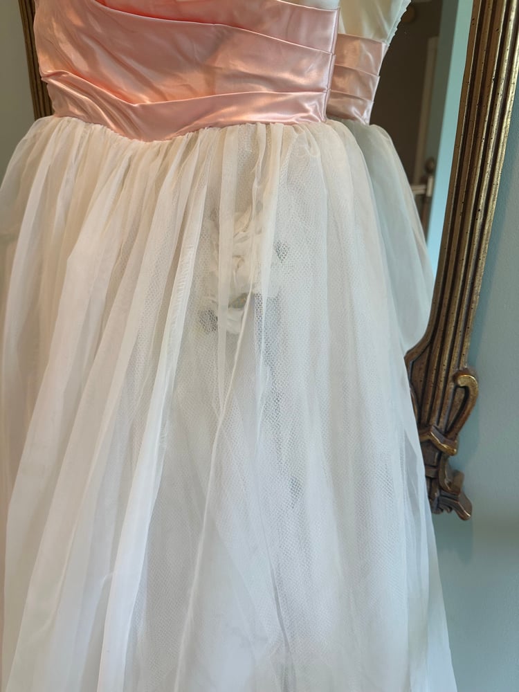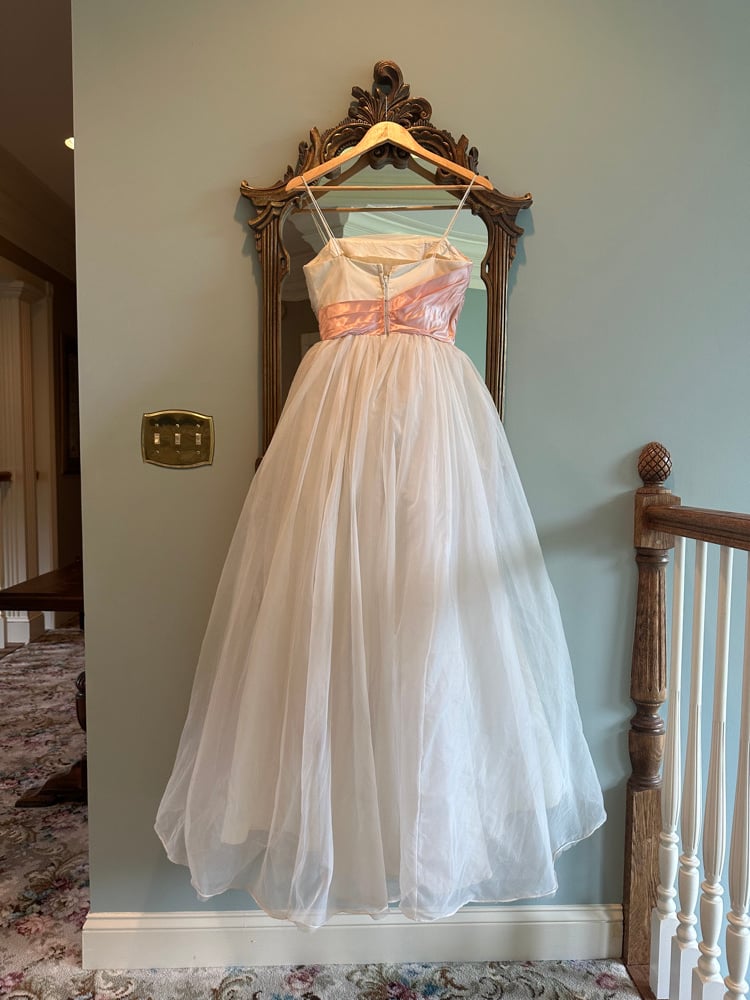 This enchanting vintage wedding dress from the late 1950s exudes timeless romance and classic mid-century style. The gown features a fitted bodice with thin shoulder straps. The bodice is softly ruched, enhancing the feminine silhouette, and is cinched at the waist with a blush satin sash, adding a subtle, romantic contrast. The full skirt, made of layered tulle, floats elegantly to the floor and conceals a poetic surprise, white flowers hidden within the layers. This whimsical detail brings a fairytale charm to the dress.