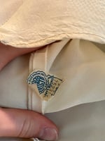 The dress is a white tone, please refer to the photos of the dress hanging for its true color. We used vintage film to photograph the dress on the model, and the color was distorted.