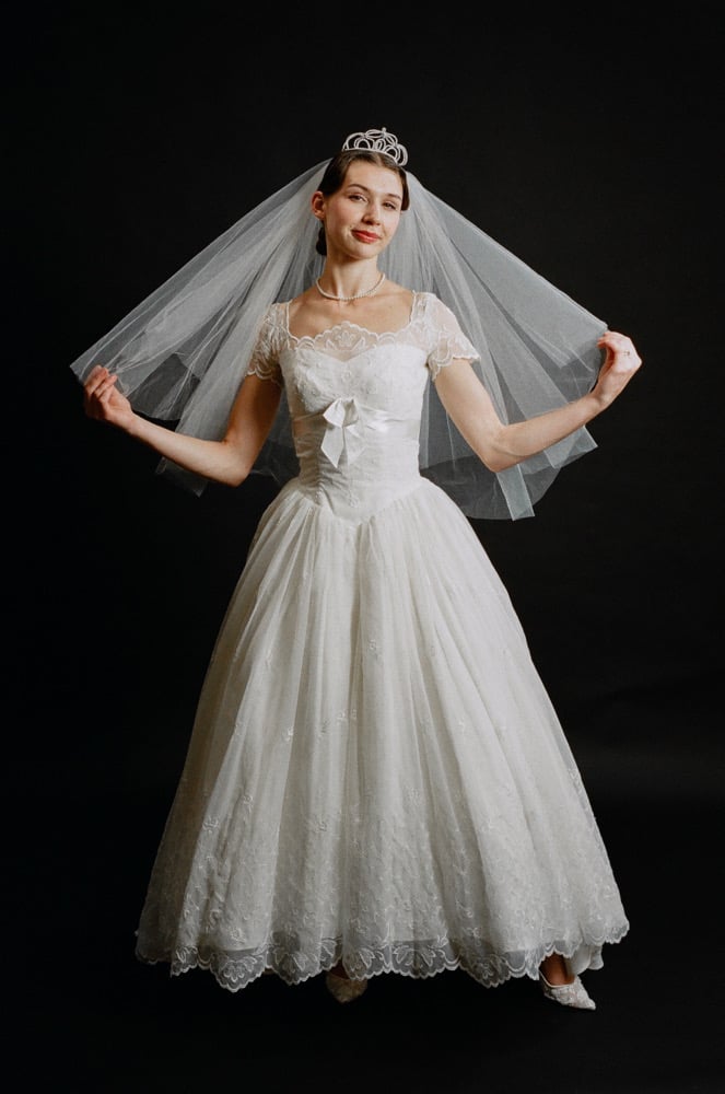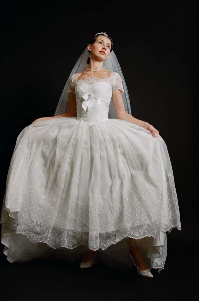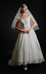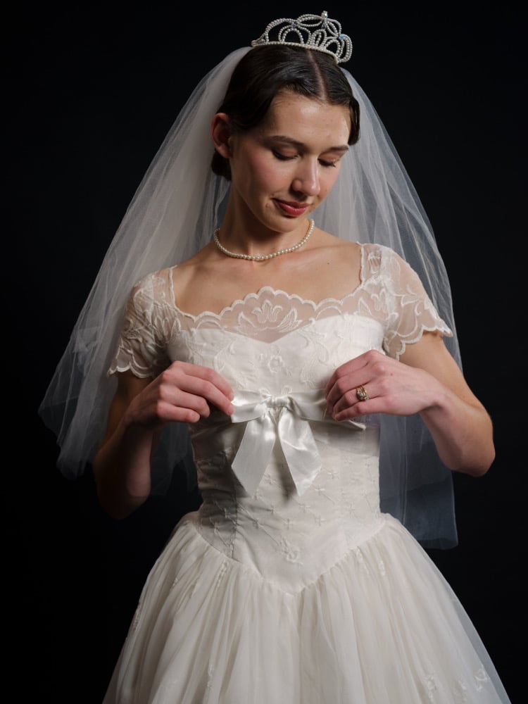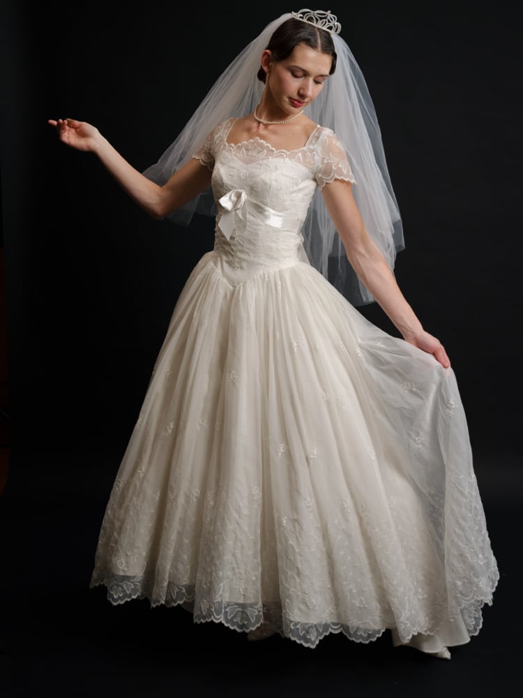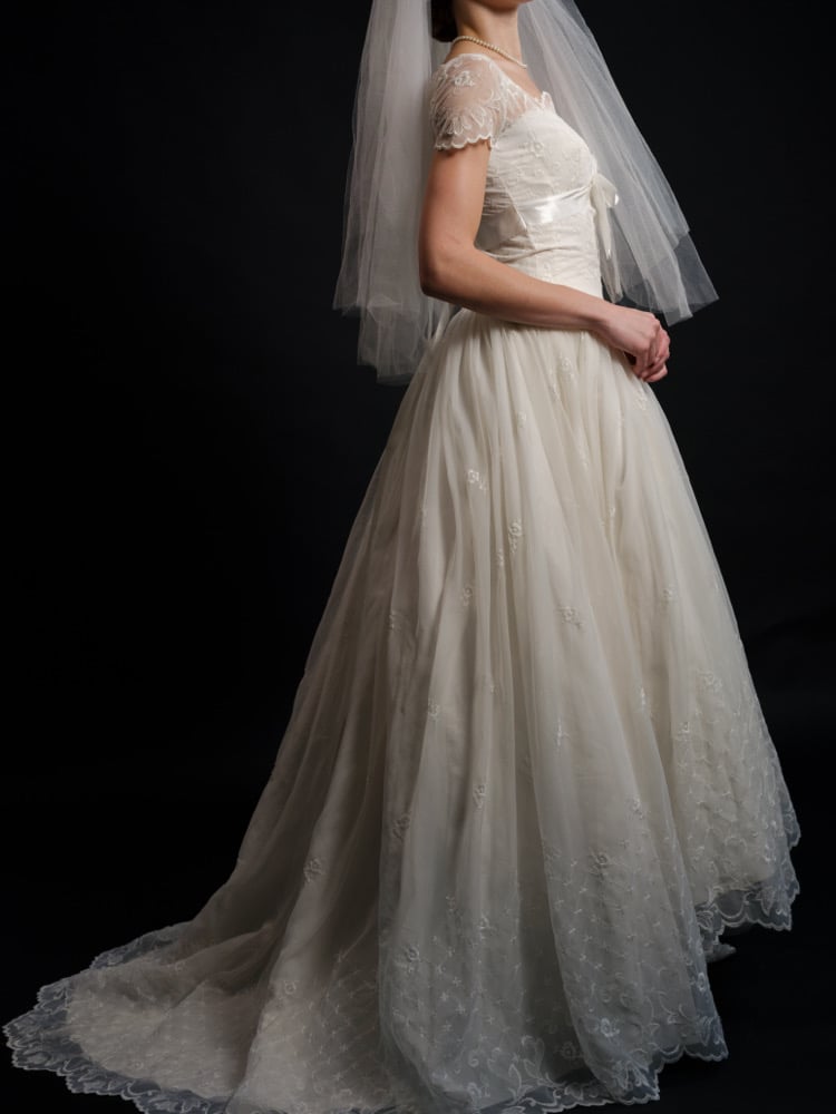 This rare piece features airy organza layered with delicate embroidered lace. Scalloped edges frame the neckline and hem, and a soft train trails behind for an extra touch of romance. A row of covered buttons and a satin bow close the dress in the back.
