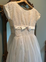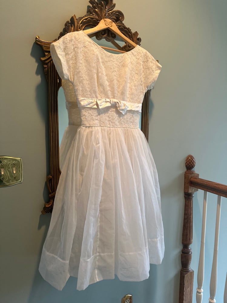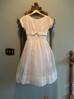 1960s mini dress featuring the classic fit and flare silhouette. A tailored lace bodice with a bow detail flows into a full skirt.