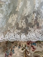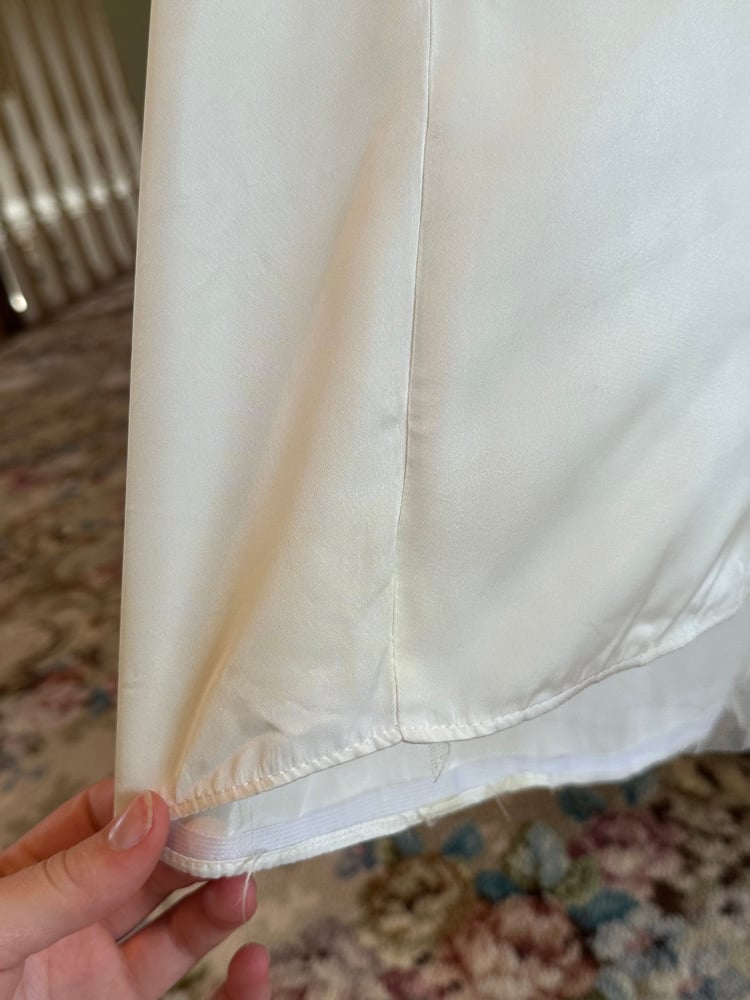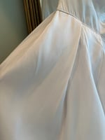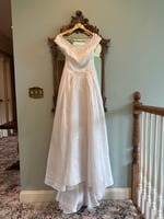 This dress has been thoughtfully restored through many hours of meticulous work. It has been carefully hand-cleaned; however, a few faint marks remain. The lace along the hem of the train has been repaired in several areas, and a few small holes were left intact as they blend seamlessly with the lace. As with all vintage garments, minor signs of wear may be present. Please refer to the photos for details.