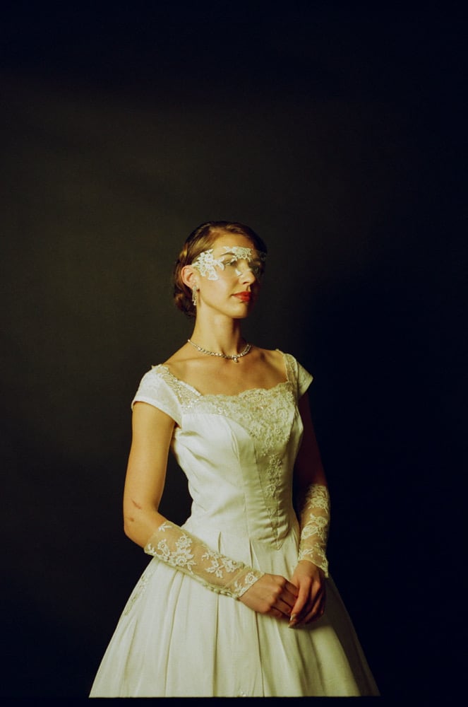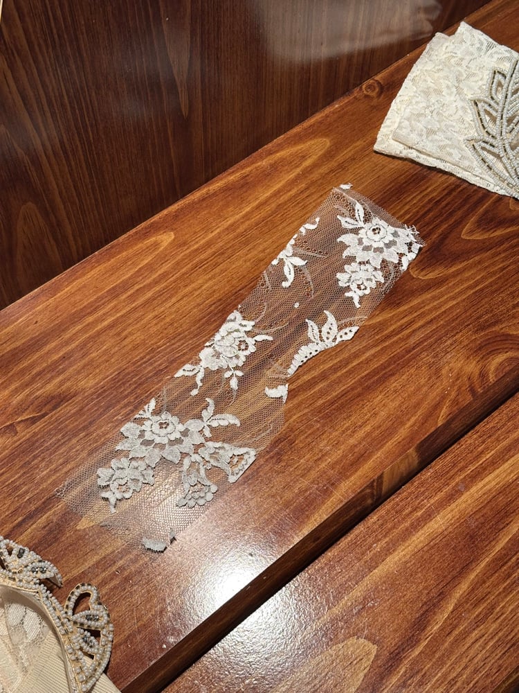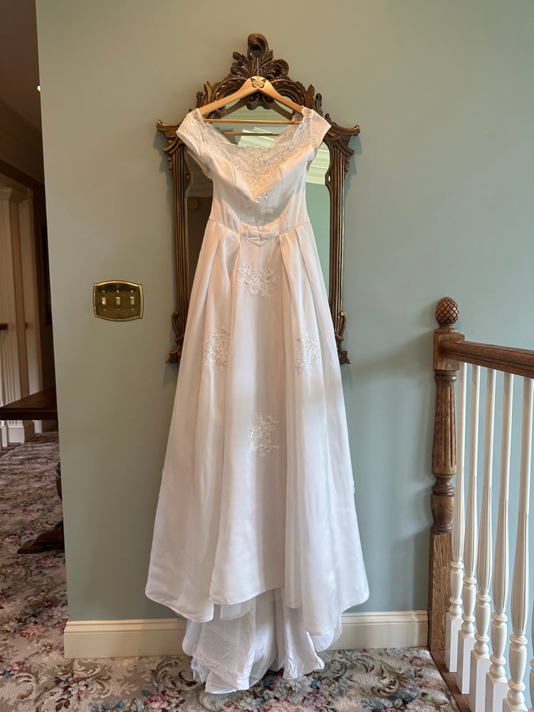 Step into timeless elegance with this beautifully restored 1950s vintage wedding gown. Crafted from a satin blend with lace appliqué details throughout. The gown features a structured bodice with a romantic sweetheart neckline softened by newly reinforced cap sleeves. Originally designed with long sleeves, the fabric was too delicate to preserve as-is, so it was thoughtfully repurposed to enhance the dress’s wearability and charm. The salvaged original lace sleeves were repurposed for gloves that perfectly complement the dress’s vintage aesthetic. Additionally, a piece of this treasured fabric has been crafted into an optional eye mask or hair accessory, offering a cohesive bridal look or a unique keepsake.
