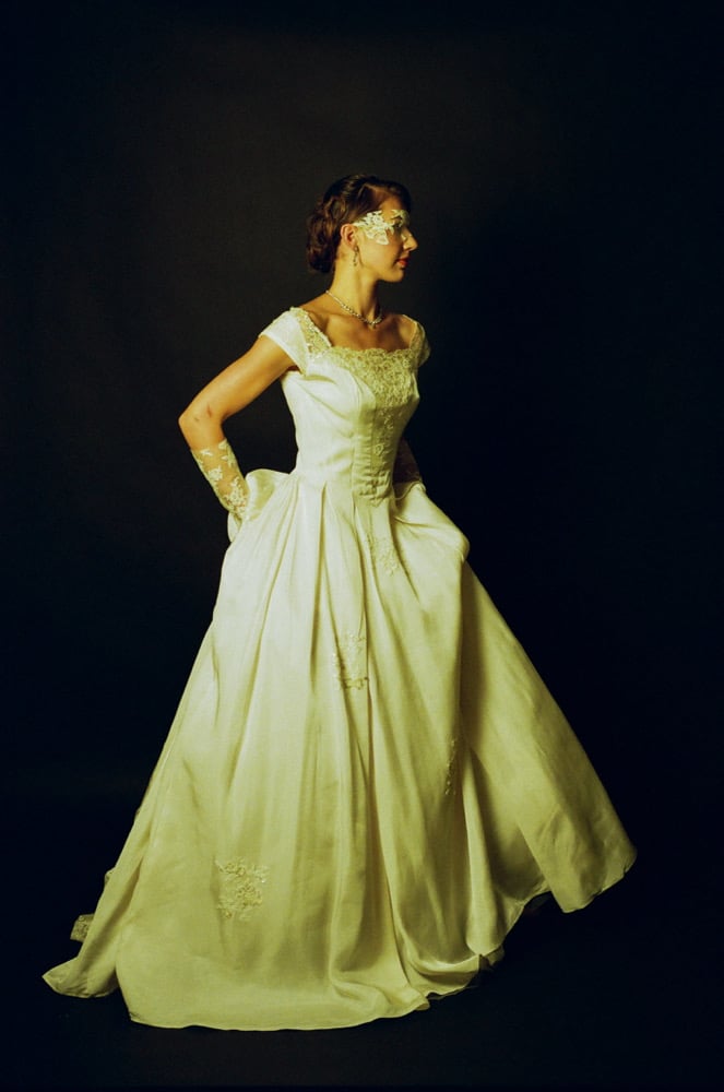 The dress is a white tone, please refer to the photos of the dress hanging for its true color. We used vintage film to photograph the dress on the model, and the color was distorted.