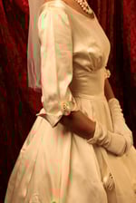 Exquisite 1950s ballgown crafted from luxurious peau de soie satin. Custom fabric flowers adorn the gown, adding a romantic, handcrafted touch. The graceful scoop neckline flows into quarter-length sleeves, each accented with delicate floral details. A beautifully fitted waistline gives way to a voluminous full skirt, creating a timeless silhouette of mid-century glamour.