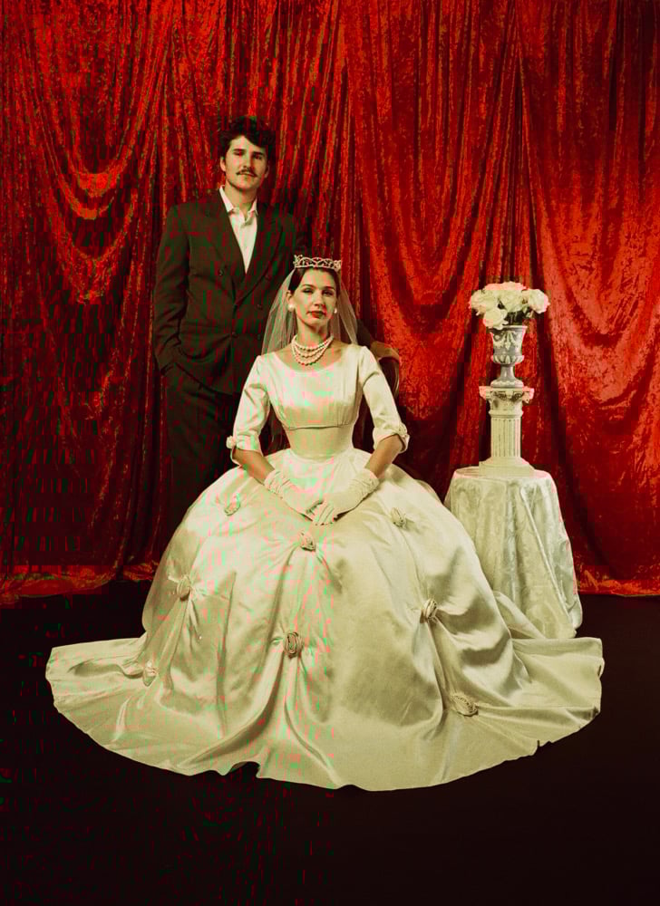 The dress is an ivory color. We used vintage film to photograph the dress on the model, and the color is not truly depicted.