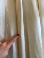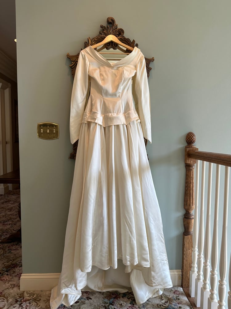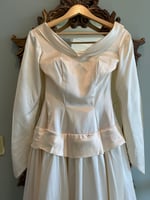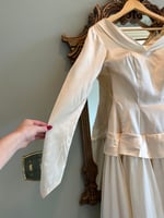 An example of mid-century excellence, this dress is composed of a thick satin and lined with interfacing for additional structure. Beautiful seams sculpt the bodice and a scooped neckline frame the face beautifully. Long sleeves come to a point at the wrist and close with buttons. A gorgeous train flows from the  dropped waist.