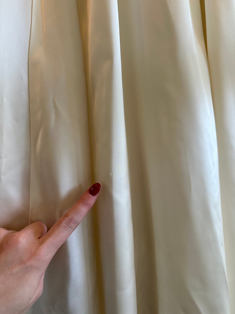 The dress has been thoroughly hand, clean and restored. Some of the seams were restitched to be reinforced. The draped detail below the waist can be worn folded up or down. We will tack the fabric folded up if you prefer it like this, just let us know!