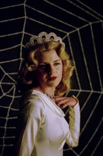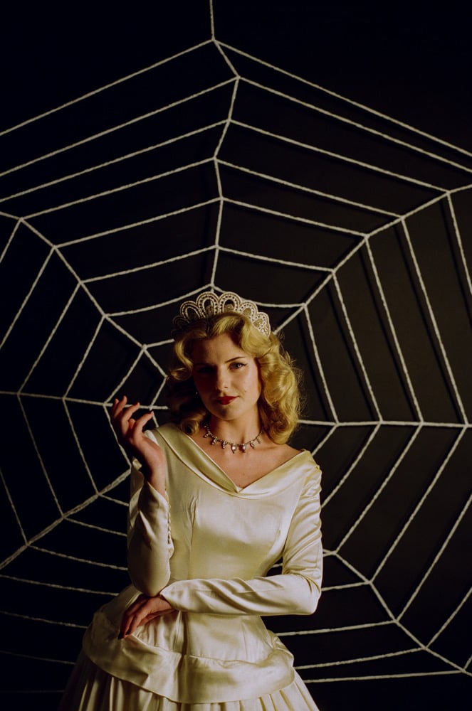The dress is a white tone, please refer to the photos of the dress hanging for its true color. We used vintage film to photograph the dress on the model, and the color was distorted.