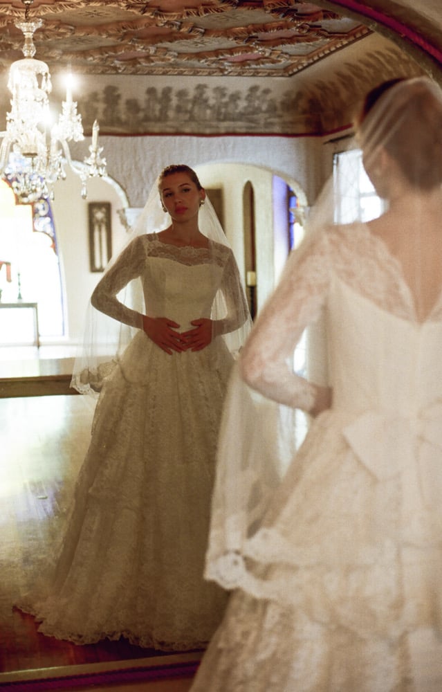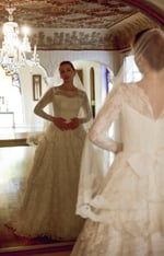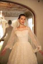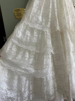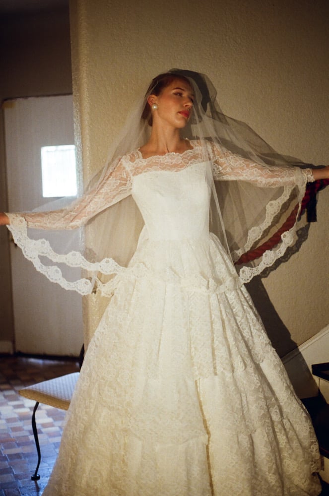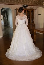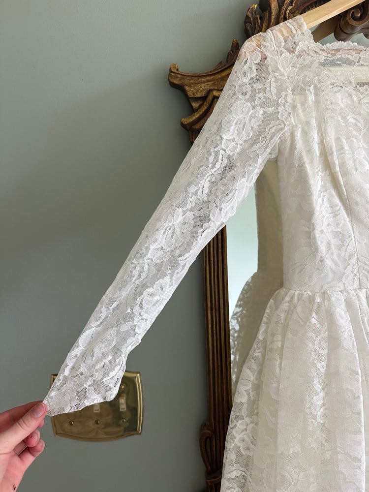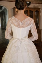 This 1950s wedding gown is made of floral lace with a structured bodice and sheer lace sleeves. The neckline is a scalloped illusion style that extends into a fitted waist with a lace overlay. The sleeves are fitted and unlined, showcasing the lace pattern all the way to the wrist. The full skirt features tiers of lace, extending into a short train. The back of the gown includes a zipper closure and is finished with a bow at the waist.