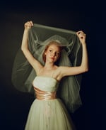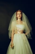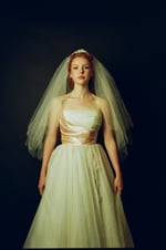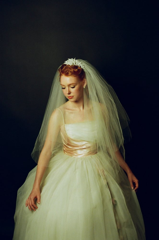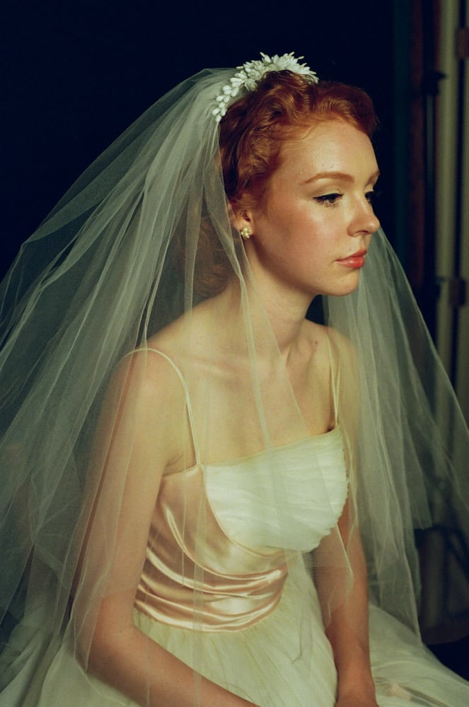 Timeless and romantic, this original 1950s bridal veil features a delicate crown of ivory wax flowers, each bloom carefully crafted and arranged to evoke the elegance of mid-century weddings. The attached soft tulle veil cascades gently over the shoulders, creating a dreamy silhouette perfect for a classic or vintage-inspired bridal look.