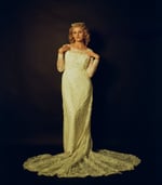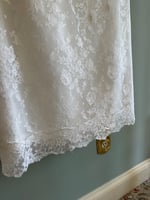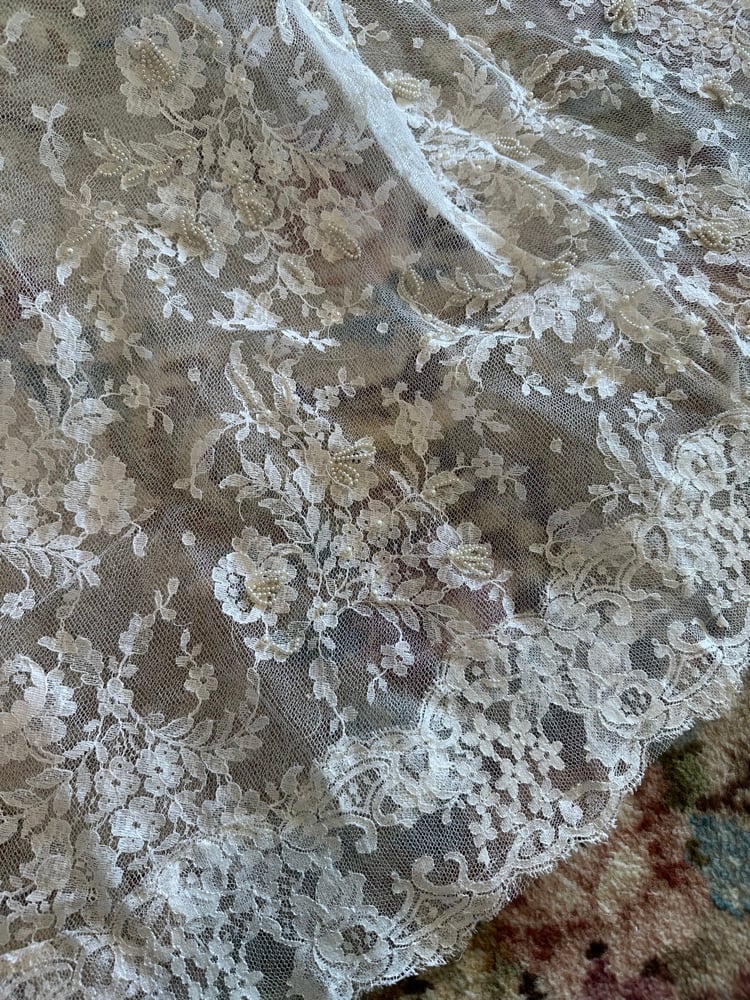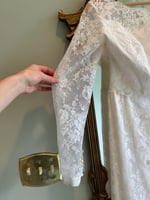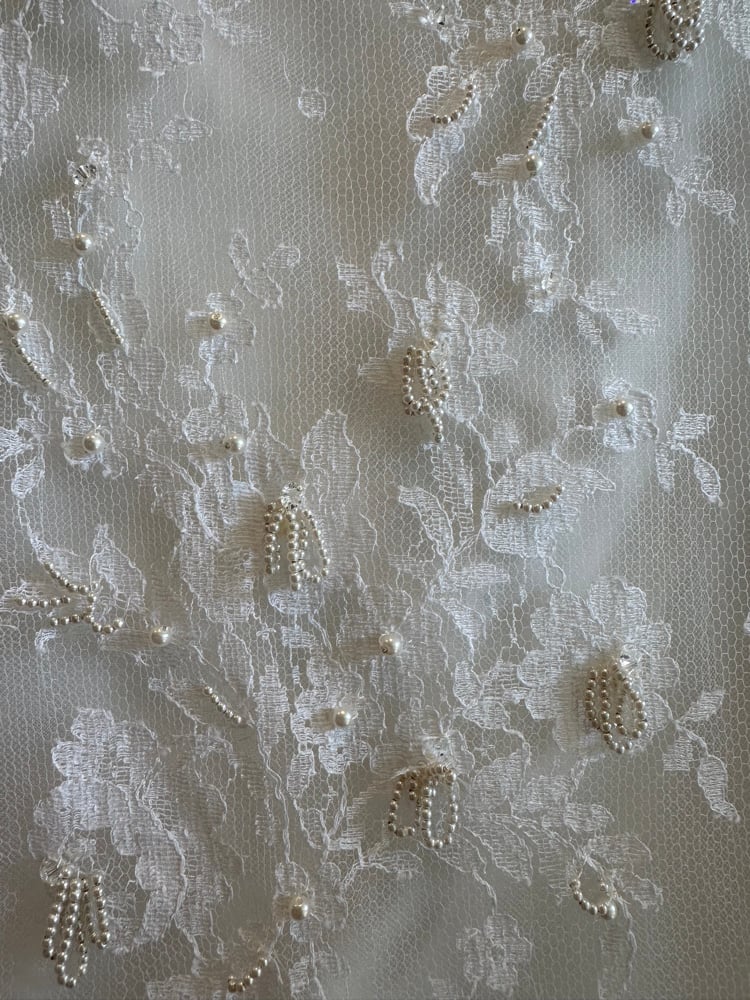 Crafted from floral lace, the gown features a figure-skimming silhouette with long sheer lace sleeves and a high bateau neckline. The dress is adorned with stringed pearl detailing throughout, adding a touch of luminous elegance. The back of the gown is finished with a row of covered buttons, leading to a detachable chapel-length lace train that flows gracefully from the waist.