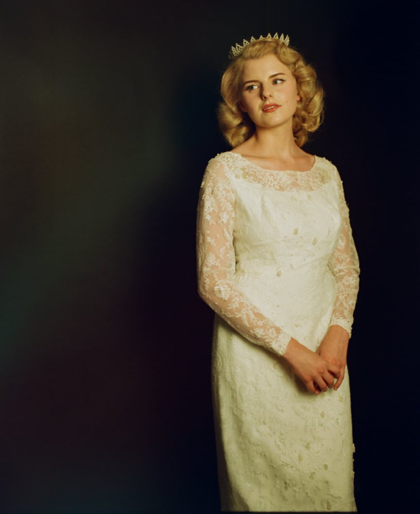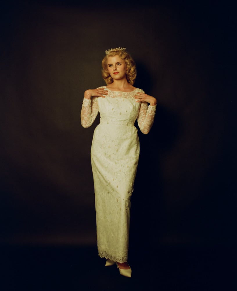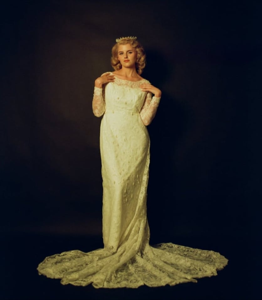 The dress is a white tone, please refer to the photos of the dress hanging for its true color. We used vintage film to photograph the dress on the model, and the color was distorted.