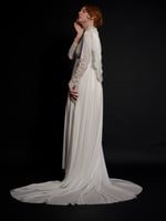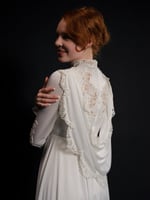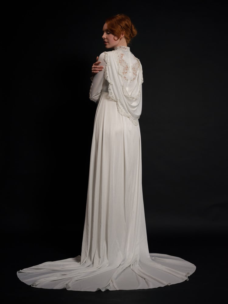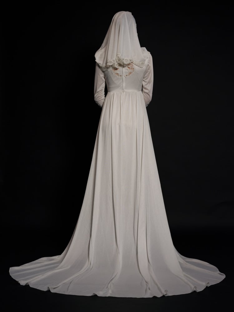 Rare 1970s wedding dress featuring a striking drape that can be worn as an accent for the back, or like a hood. The dress is composed of a Comfortable polyester, fabric and accented with lace and pearl detailing. A small train flows behind the dress.