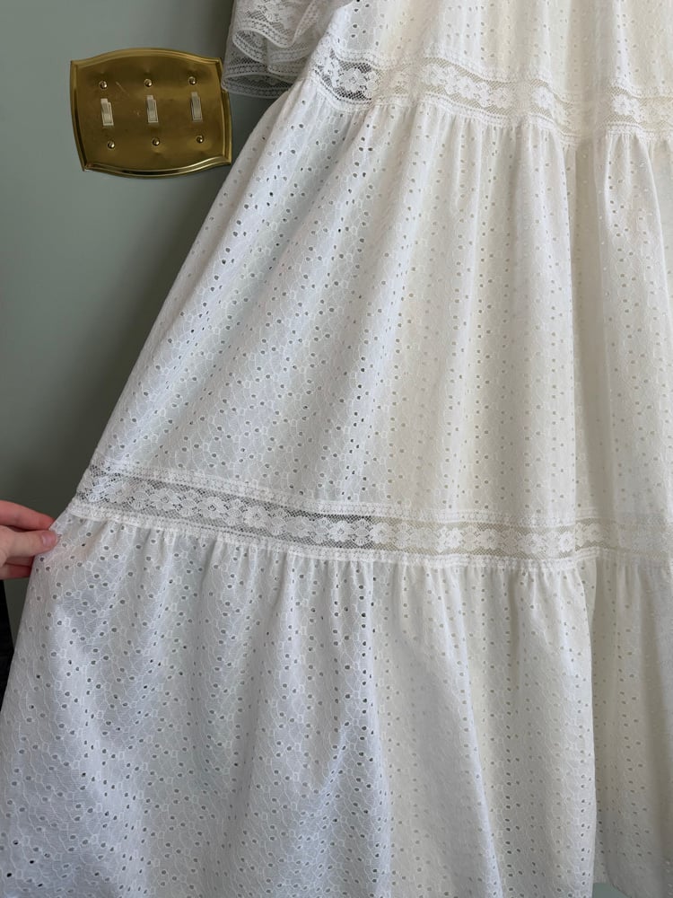 Classic vintage wedding dress from the 1970s made from a beautiful eyelet fabric. There is a square neckline trimmed in lace and beautiful bell sleeves. The waistline has sheer lace for some skin to poke through and then flows into a small tiered skirt. The Dress is semi sheer in direct sunlight so you might want to wear a slip underneath. This dress is in great condition with no major flaws. Please note all items are vintage and might have minor signs of wear due to its age.