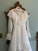 Incredible 70s dress with a fitted bodice adorned with ruffled lace that leads to a full skirt featuring tiers of intricate lace and a large train.