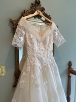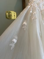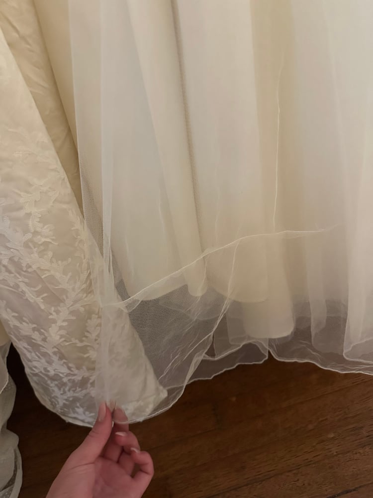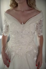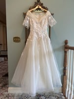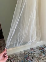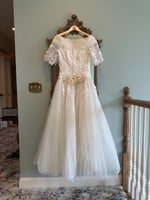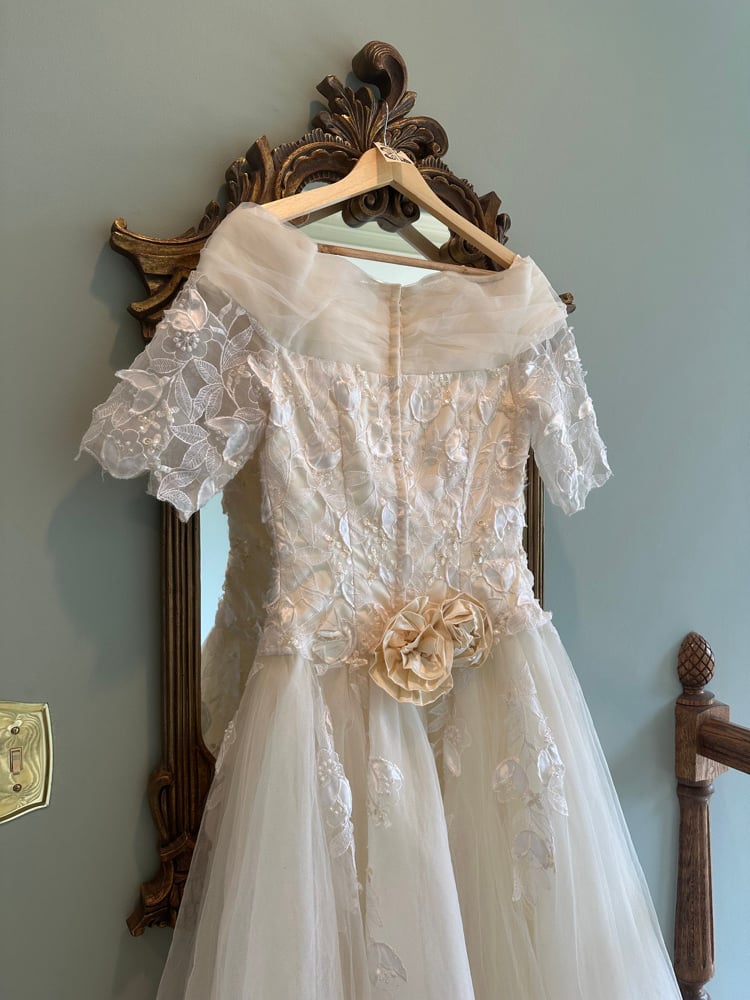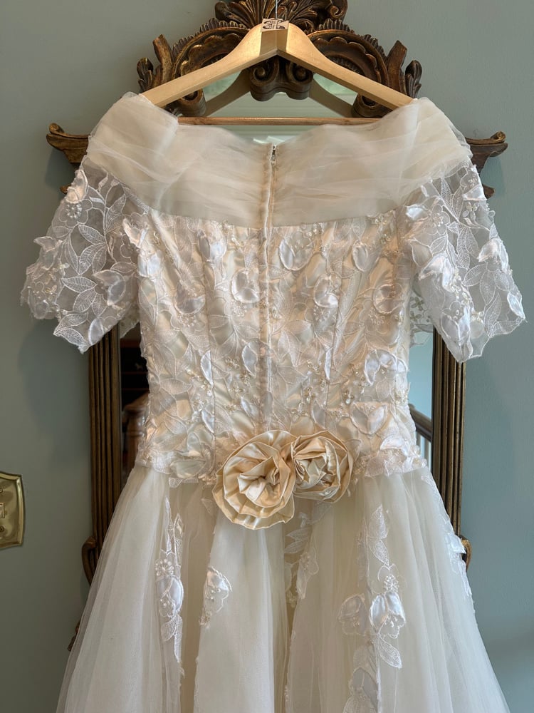 This 1980s dress takes inspiration from the 50s with its fitted bodice and full skirt. Intricate lace and sequin details adorn the bodice with a beautiful ruched neckline. The full skirt has layers of tulle that move so beautifully.