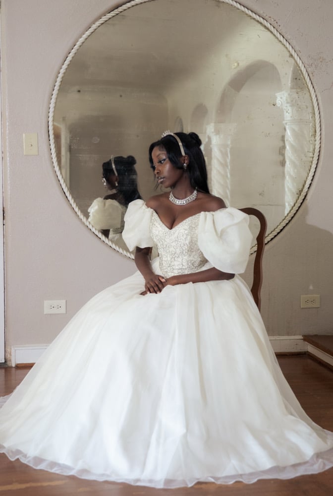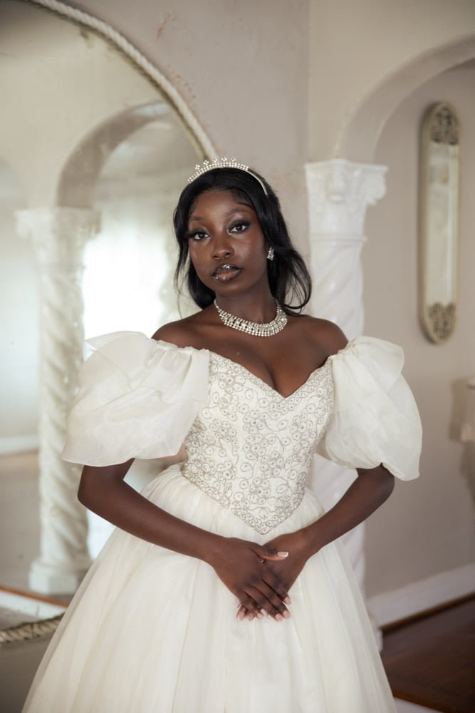 1980s deadstock ivory ball gown by the designer "Mike Benet". This vintage dress has a beautiful princess silhouette with the sweetheart neckline and fitted bodice adorned with embossed rhinestones. The large puff sleeves can be worn on or off the shoulder. There is a small basque waistline that flows into a full skirt with a sewn in crinoline.