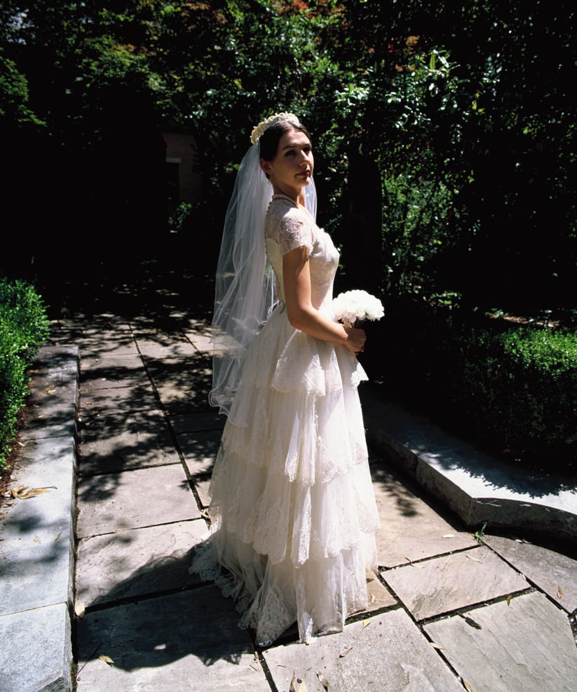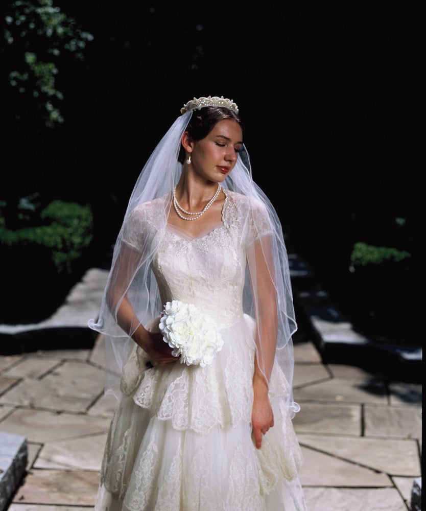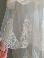 1950s wedding dress with fitted bodice and basque waistline that leads into an exquisite tiered skirt with intricate lace. The draped bustline with subtle sequins add beautiful details. Covered buttons secure the back of the dress in an elegant manner.