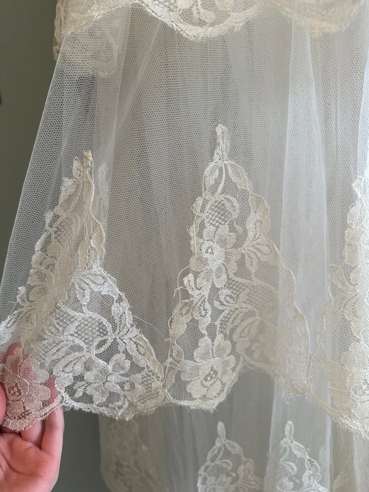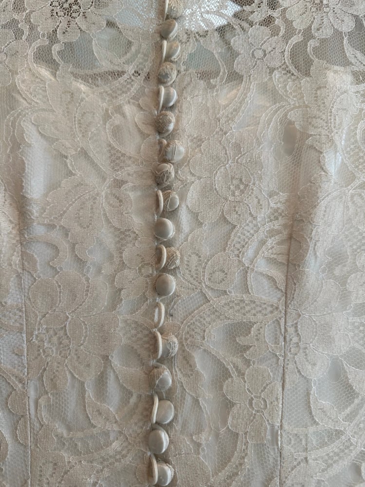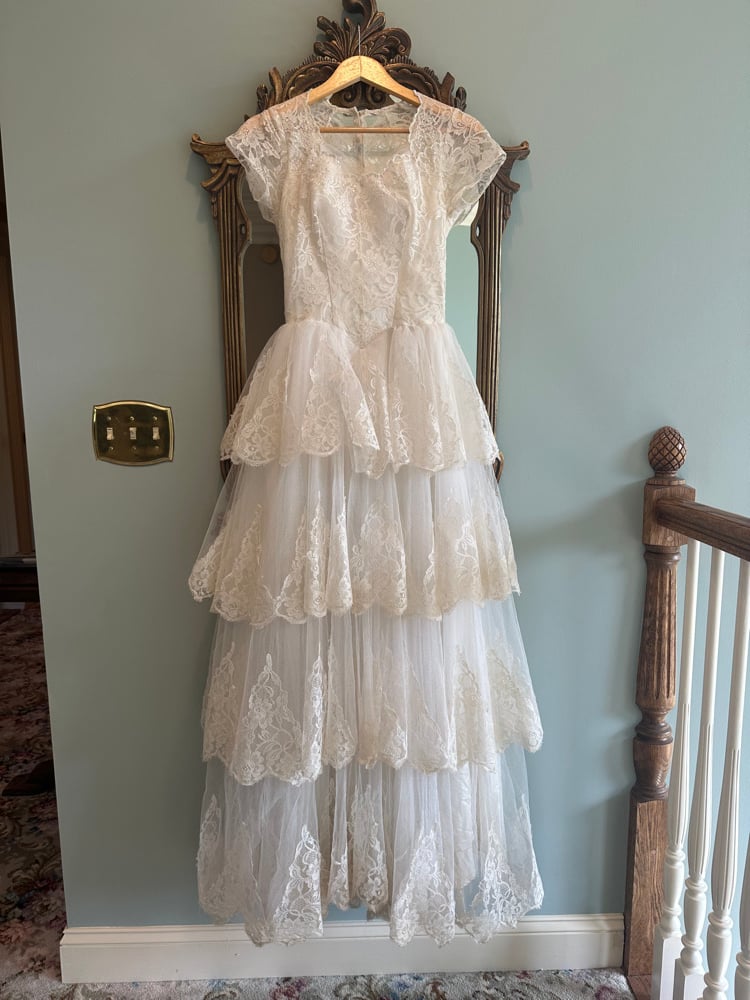 This dress is in good condition ,Please note all items are vintage and might have minor signs of wear due to its age. There are a few small holes in the lace, please refer to photos. There were some missing lace panels on the bottom tier, so we used authentic lace from the 1950s to draft panels and replace them.