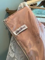Rare Neiman Marcus mini dress from the 1950s. Featuring a nude satin lining adorned with intricate lace and a scalloped hem. A nude velvet bow cinches the waistline to complete the look. This dress is tailored to perfection and fits like a 50s dream. It's made of impeccable quality and includes the original crinoline that ties around the waist under the dress.