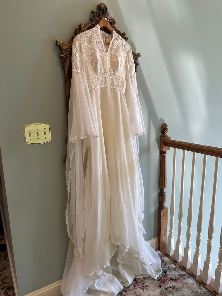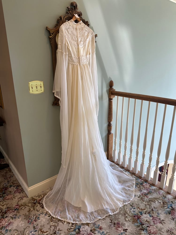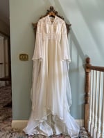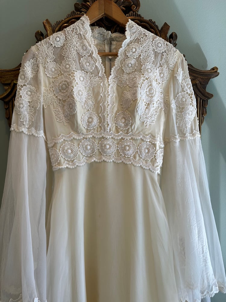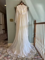 A truly enchanting piece from the 1970s, this rare gown features floor length bell sleeves that bring drama to every movement. An empire waist leads into a beautiful skirt adorned with lace appliqués. A small train trimmed in lace flows behind the dress and has a floral accent with a wrist loop to hold the train.