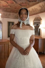 The dress features a fitted bodice with ruching and a bow accent. The capped sleeves can be styled on the tips of the shoulder like a boatneck, or off the shoulder. The full skirt has two tiers of beautiful lace with a scalloped hem.