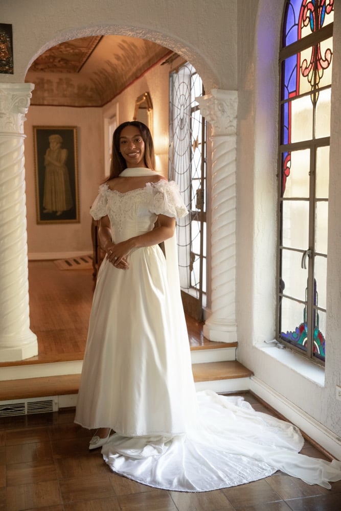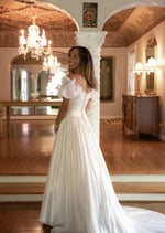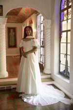 The dress features a fitted bodice with piped princess seams. Lace appliques, pearls, and sequins adorn the sweetheart neckline. The elastic in the sleeves has been replaced and can be worn on or off the shoulders. Simple flowers accent the sleeves. The full skirt flows into a small train trimmed in lace.