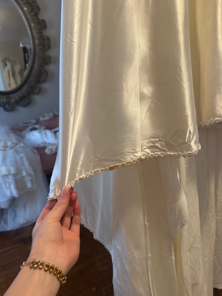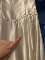 This dress is in good condition , Please note all items are vintage and might have minor signs of wear due to its age. We have cleaned the dress thoroughly, but there are a few spots on the lace of the trains hem that didn't come out. There is also some spots on the satin that seem to be wear an aplique was glued on. Please refer to photos.