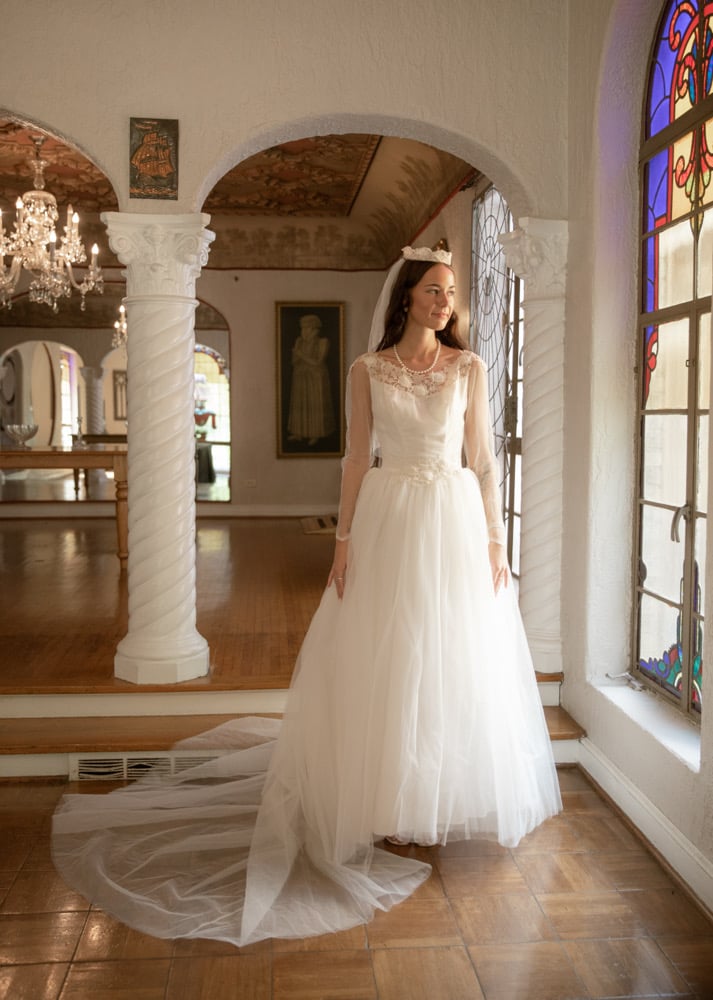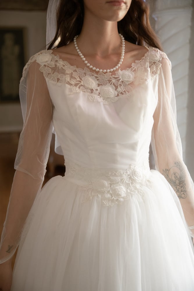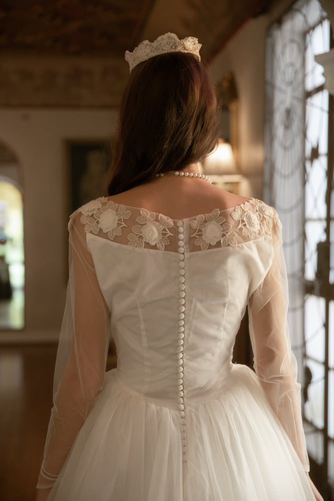 Originally worn in November 1953, The dress features a fitted bodice with floral lace appliqués. Sheer sleeves extend and button at the wrist. A subtle basque waist leads into a full tulle skirt and small train. Covered buttons gracefully secure the dress in the back.