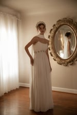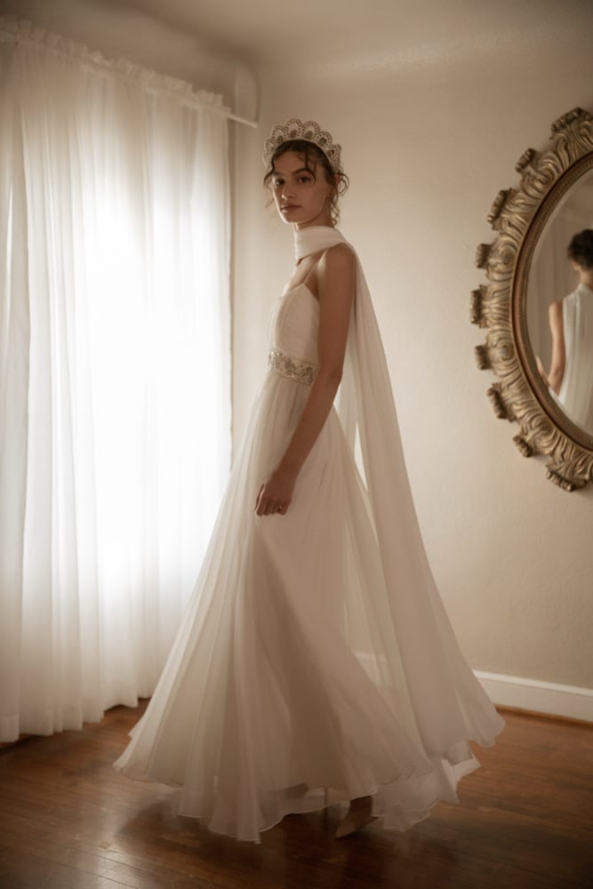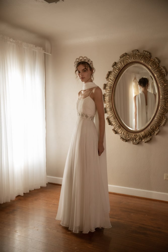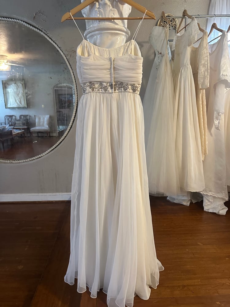 The dress was designed by the label "Mike Benet" in the 1960s using a chiffon fabric. Beaded details adorn the bodice and thin straps hold the dress in a sleek manner. The dress is modeled with a scarf accessorized around the neck, this is not included. You will need to wear a slip under the dress to prevent sheerness in certain lighting.