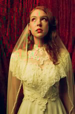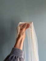 A fingertip tulle veil trimmed with elegant strands of pearls perfect for completing a vintage look. This is a modern veil, carefully sourced to match the styles of vintage bridal fashion. The veil is attached to a comb to securely hold in the hair.