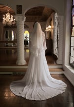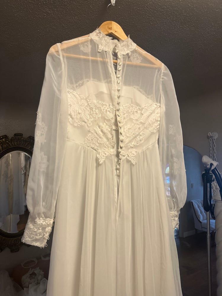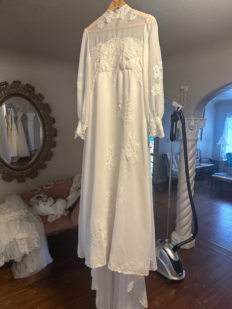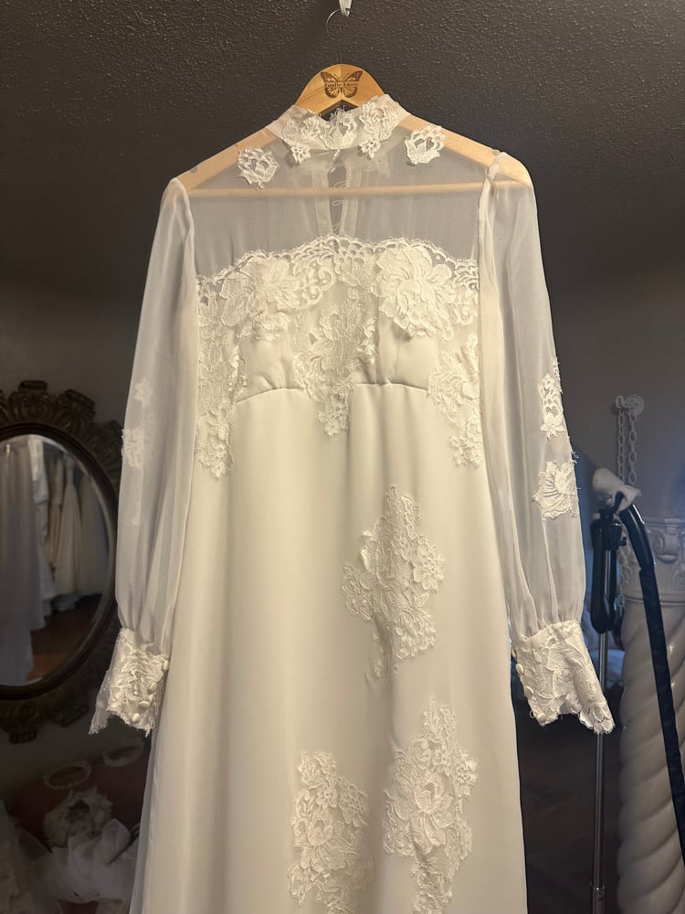 The dress features a simple silhouette with an empire waist and long sleeves that are cuffed at the wrist. Lace appliqués are sewn on throughout and a small train flows from the skirt! Covered buttons close the dress in the back with elastic loops.