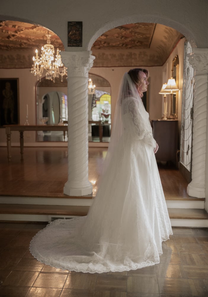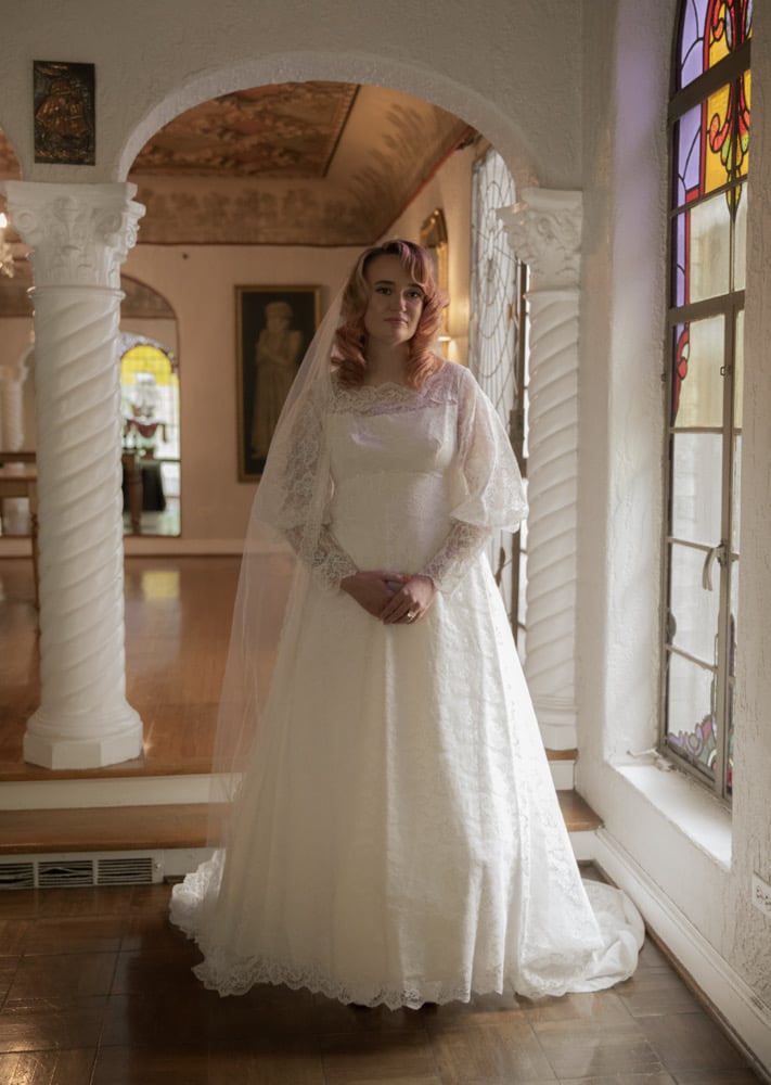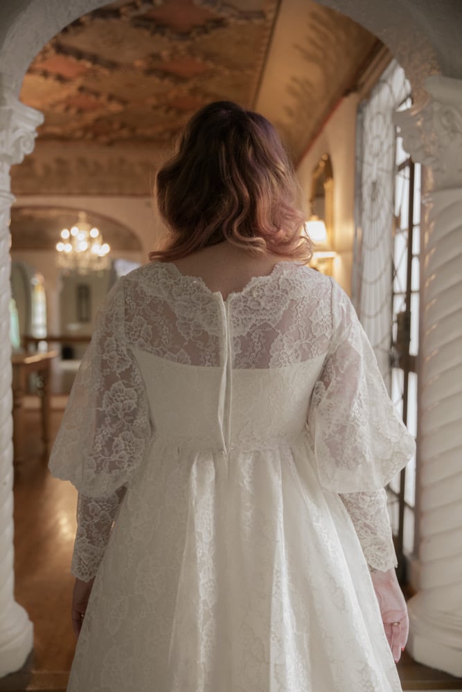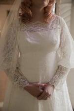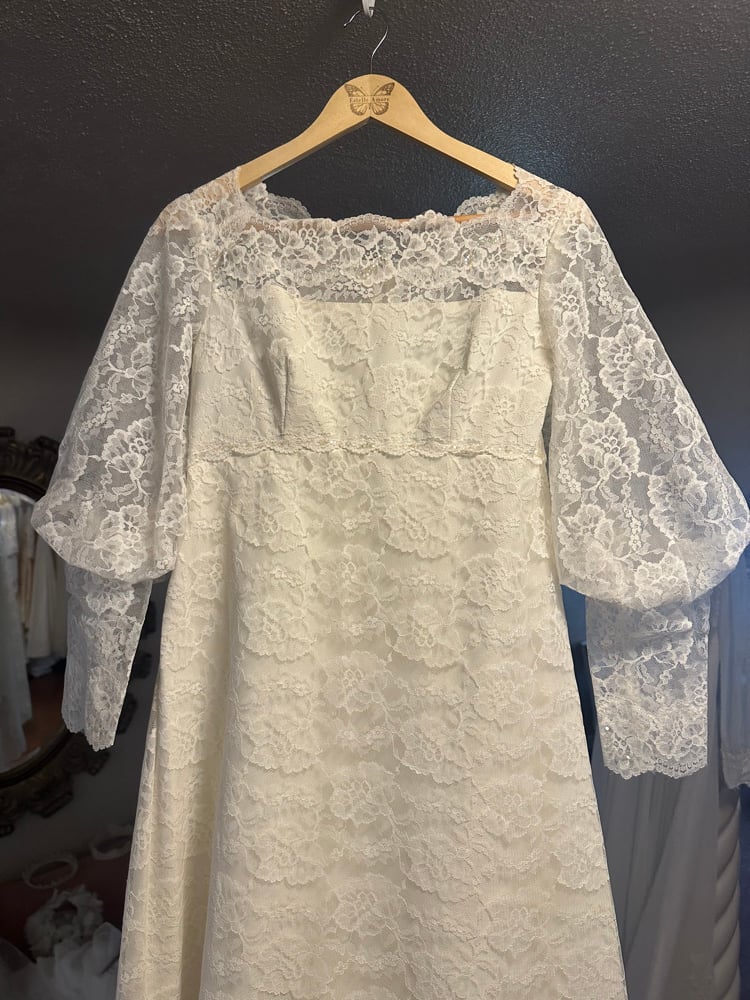 The dress features a lace fabric throughout with an empire waistline and long bishop sleeves. A full skirt leads into a small train. Some subtle sequins are sewn throughout the dress for a touch of sparkle!